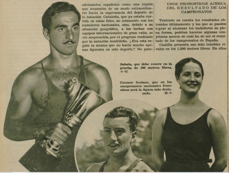 Foto de portada: Ángel Sabata Figa. Fotos de abajo: 1- Sabata, el segundo por la derecha, junto a Trigo, Heitman y Palatchi; 2- Sabata, en los Campeonatos de Europa Magdeburgo 1934; 3- El librista Sabata, favorito en el hectómetro en los Campeonatos de España de 1934; 4- Ángel Sabata, a la derecha, con su amigo y compañero Ricard Brull en los Campeonatos de España de Valencia en 1935; 5- Speisseger, Sabata y el gran equipo del CNB-Selección española de waterpolo (1934); y6- El gran ‘siete’ del CNB en los años 30, con Sabata arriba a la derecha (1935) / Prensa de la época.