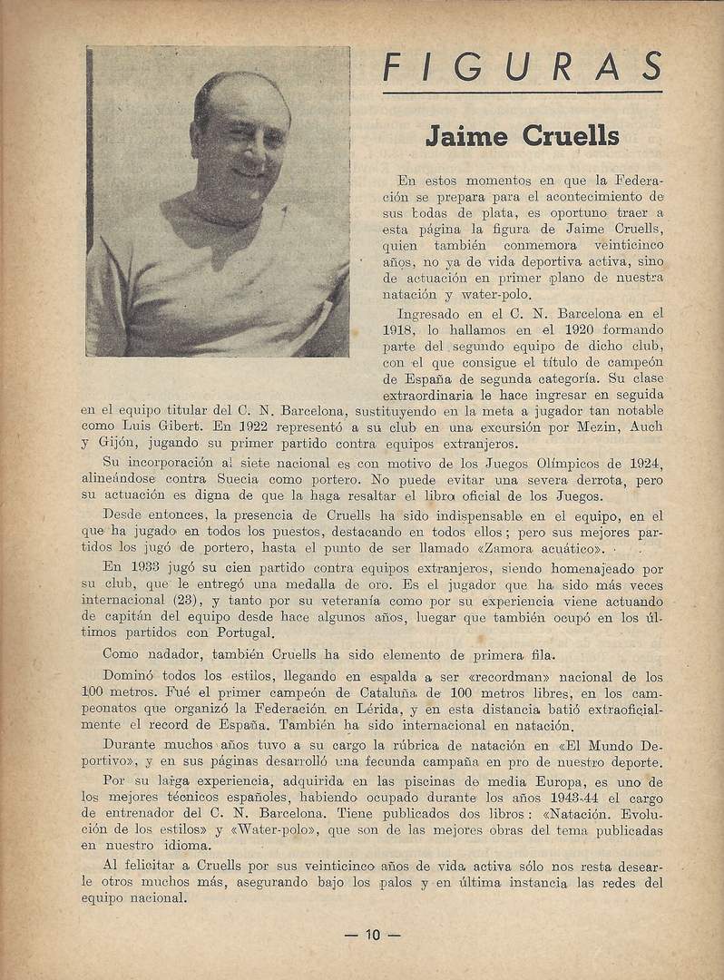Pie de foto de portada: Jaume Cruells Folguera (1906-1968). Fotos de abajo (de izquierda a derecha y de arriba a abajo): 1- En 1924 como equipo nacional en los JJOO de París (Jaume Fontanet, Lluís Gibert, Francesc Gibert, Josep Maria Puig, Enrique Granados, Jaume Cruells y Manuel Basté); 2- En 1928 como equipo nacional en los JJOO de Amsterdam (Ángel Sabata, Gonçal Jiménez, Josep Maria Puig, Rafael Jiménez, Jaume Cruells, Mariano Trigo y Manuel Majó); 3- En 1935 como equipo del CN Barcelona (José Cabrejas, Rafael Jimenez, Ángel Sabata, Ramon Borrás, Ricard Brull, Joan Gamper y Jaume Cruells; 4- Jaume Cruells ejerce de capitán español en el Francia-España en París junto al líder galo Padou (1936); 5- En 1945 como equipo nacional con el chándal con el escudo de la Federación frente a Portugal (Jaume Cruells, Ramón Borrás, Ricard Brull, Joan Gamper, Ángel Sabata, Rafael Jiménez y Francisco Castillo; y6- En 1946, biografía publicada en el Boletín de la Federación Catalana, cuando aún era titular de la portería española y con 40 años todavía se postulaba para jugar los JJOO de Londres 1948 / Archivo Juan Antonio Sierra Puerto.