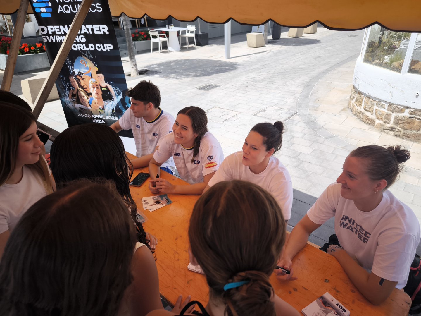 Las medallistas de este año Ángela Martínez y la alemana Lea Boy, junto a María de Valdés, Candela Sánchez, Paula Otero, Mario Méndez y Mateo García han hecho las delicias de los más pequeños, y no tan pequeños, con la firma de autógrafos a los fans al finalizar la Copa del Mundo de Aguas Abiertas Ibiza 2026.