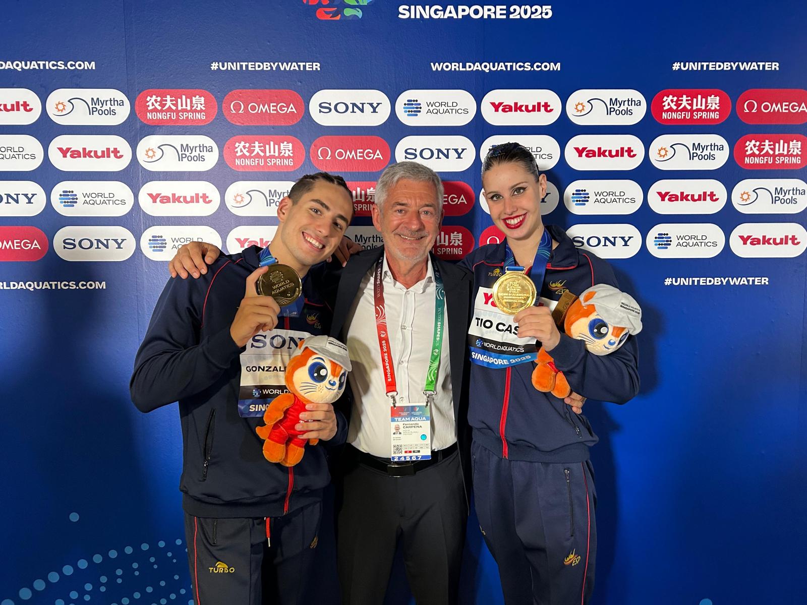 Comunicación RFEN Aquatics. Fuente: Presidencia. Foto: Fernando Carpena con los multimedallistas Iris Tió (6) y Dennis González (5) / Rfen